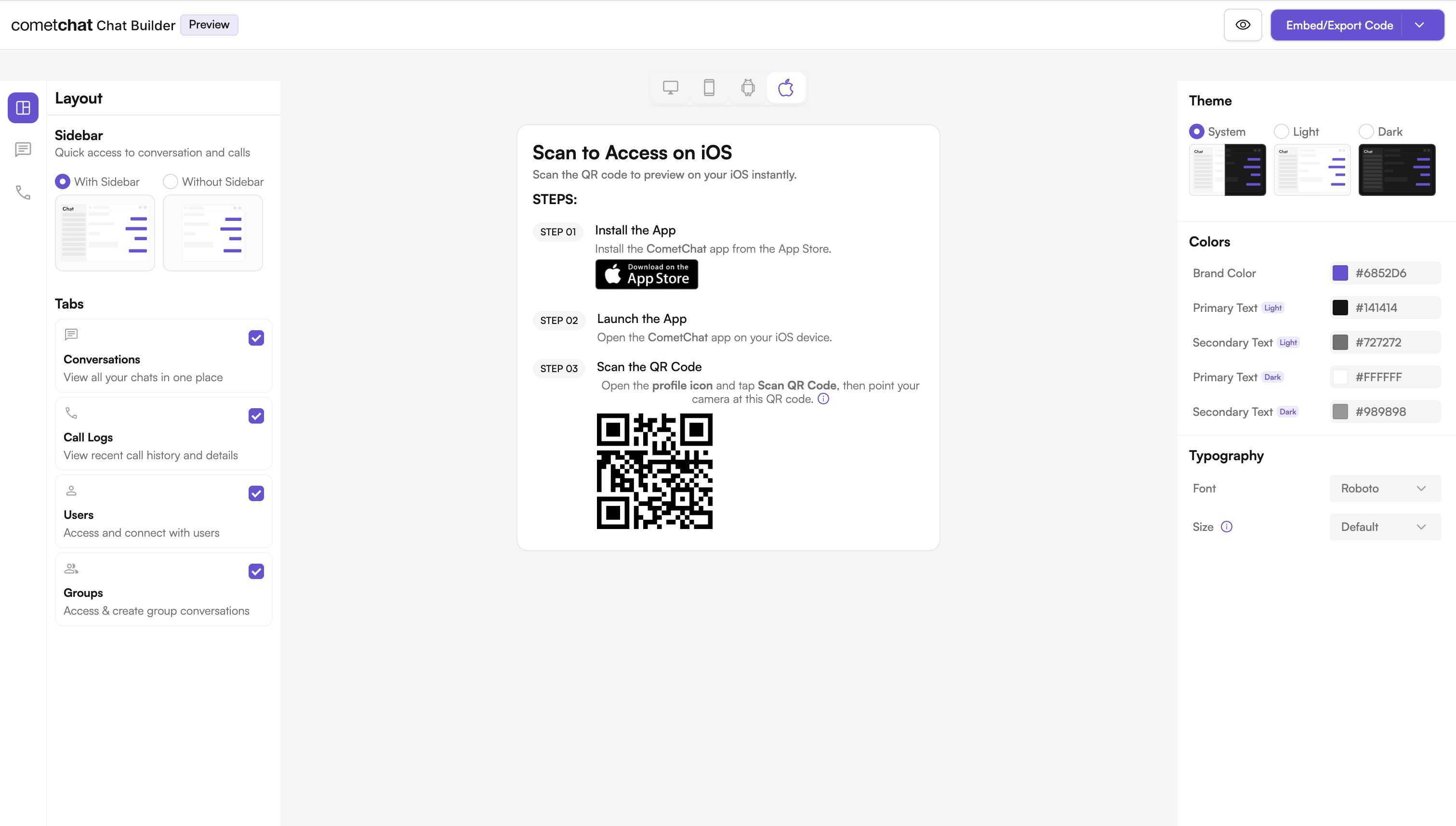 • Load settings via Builder (recommended): Use the CometChatBuilder package and load settings via JSON or live QR sync.