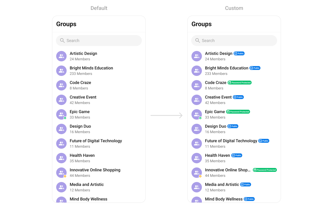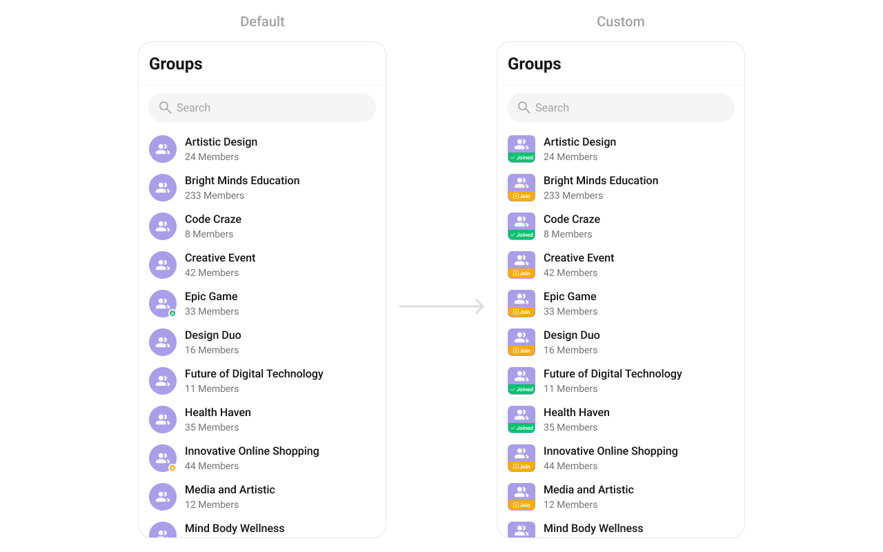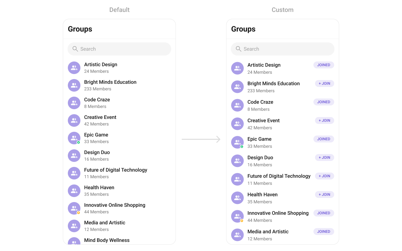 To fit your app’s design requirements, you can customize the appearance of the groups component. We provide exposed methods that allow you to modify the experience and behavior according to your specific needs.